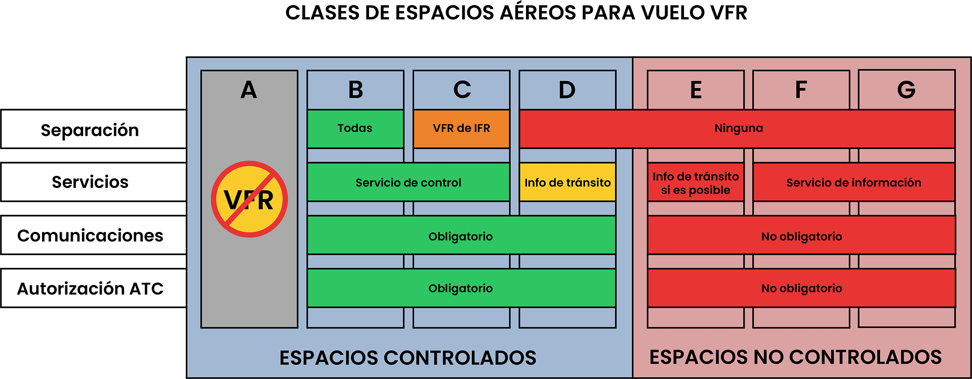 - Clase G: Espacio no controlado; pilotos operan bajo reglas de vuelo visual (VFR).