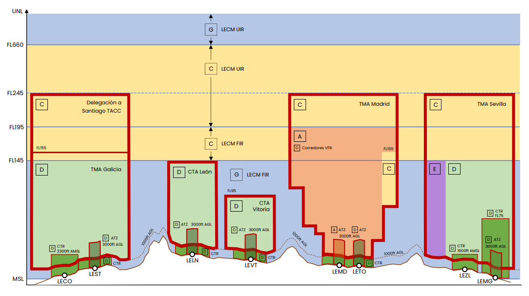 Si las carreteras se dividen en autopistas y autovías, carreteras de doble sentido nacionales y autonómicas, y otras categorías menores, el espacio aéreo se clasifica en siete tipos, a cada cual se le asigna una letra. En función del tipo se puede volar VFR (reglas de vuelo visual) o no, o es obligatorio comunicar y obtener autorización de control aéreo o no.