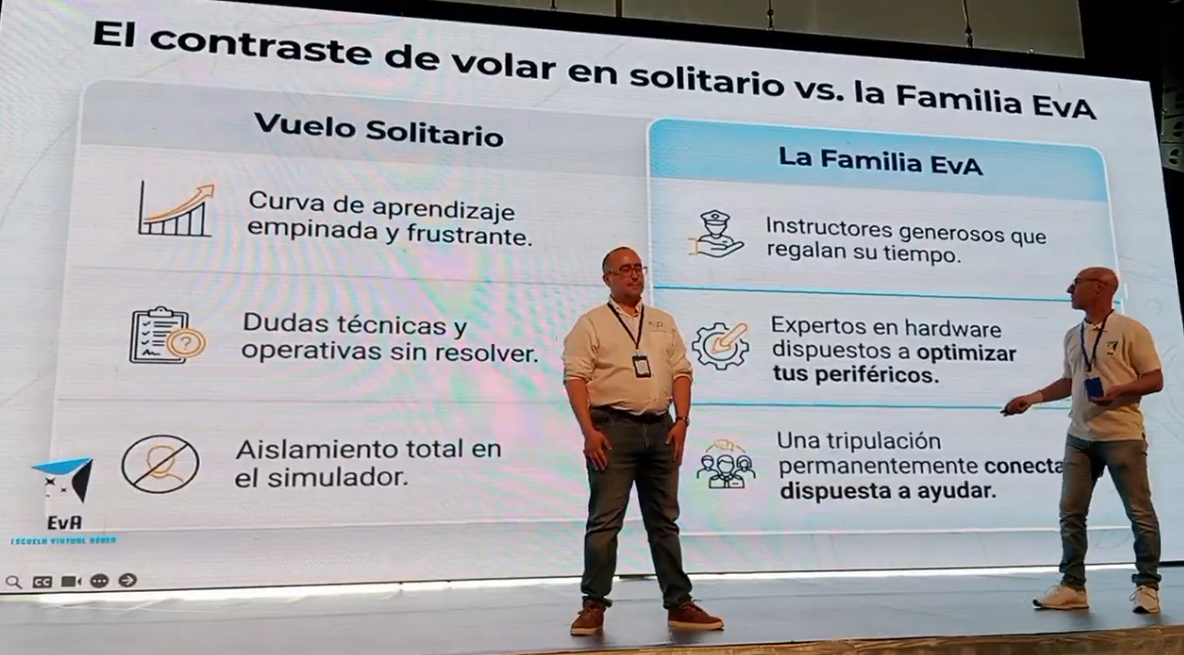 Ya a primera hora de la tarde Vicente Bargues y Santi Martínez nos vinieron a explicar cómo funcionaba EvA, para que las personas interesadas en la aeronáutica disfruten también de la simulación. Ellos te ofrecen su tiempo y trabajo para que sus alumnos puedan aprender tanto desde cero como a perfeccionar su sistema. Ofrecen un coste gratuito pero con condiciones: esfuerzo, tiempo e implicación. Muy interesante su escuela, os dejamos el enlace para más información.