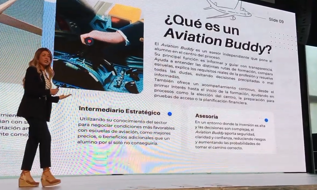 La primera charla fue por parte de Ellas Vuelan Alto, su vicepresidenta Gema Martín nos contó su historia personal y cómo comenzó en el mundo aeronáutico sin tener clara su vocación pero que fue convirtiendo en algo que terminó siendo su pasión. Se enfocó mucho en las mujeres preguntándose por qué no hay más público femenino, las últimas estadísticas indican que tan solo un 30% estudian este tipo de carrera universitaria. Indicaba que hacían falta referentes que hagan que las mujeres crean que pueden tener este oficio. Cuentan con tienen más de 80 empresas socias, tienen aseguradoras, centros de formación, centros sanitarios, etc. No es una asociación de mujeres sino de todos, para hacer de este sector un camino accesible a todo aquel que quiera involucrarse.
