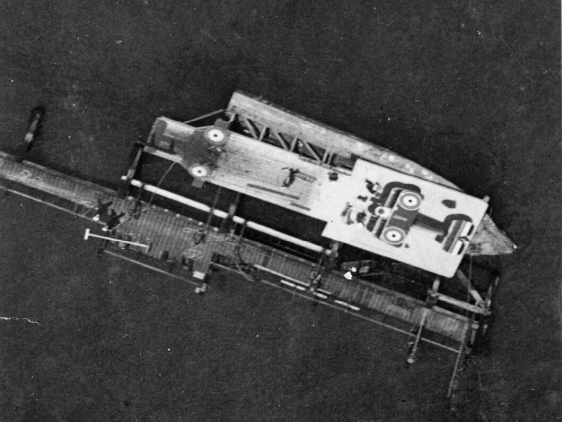 - A Sopwith Camel on board a lighter beside the jetty.