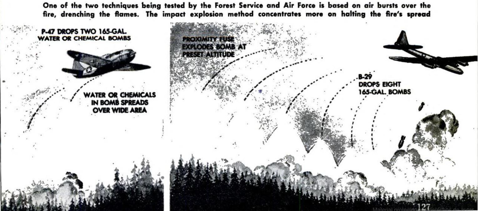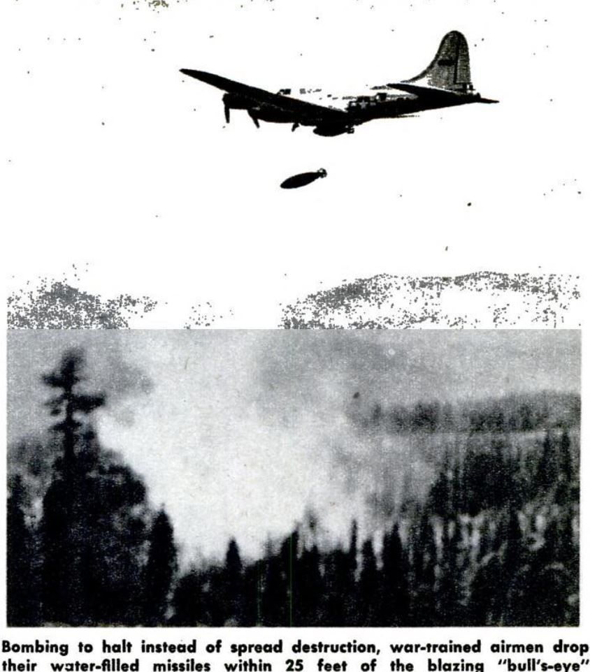 Ya hemos visto que los intentos de apagar fuegos desde el aire habían comenzado casi desde el mismo momento en el que se había pensado que el avión podía servir como arma para sembrar la destrucción desde el aire. Y por eso tampoco es de extrañar que se asociaran ambas ideas: si los aviones podían lanzar bombas con precisión contra objetivos enemigos, ¿por qué no hacerlo contra las llamas? Al comienzo se desestimó por falta de precisión, pero tras el aumento de la misma durante la Segunda Guerra Mundial, gracias a las miras Norden en el bombardeo horizontal, a los bombarderos en picado, y a los cazas convertidos en aviones de ataque a tierra, se retomó la idea. Y es por eso que, tras esta guerra, el ejército y el servicio forestal estadounidenses retomaron la idea y ensayaron el bombardeo con bombas llenas de agua desde P-47s y fortalezas volantes que, aunque las fuentes hablan de B-29, las fotos corresponden a B-17s y la película de British Pathé a B-29s, así que asumimos que se probó con ambos.